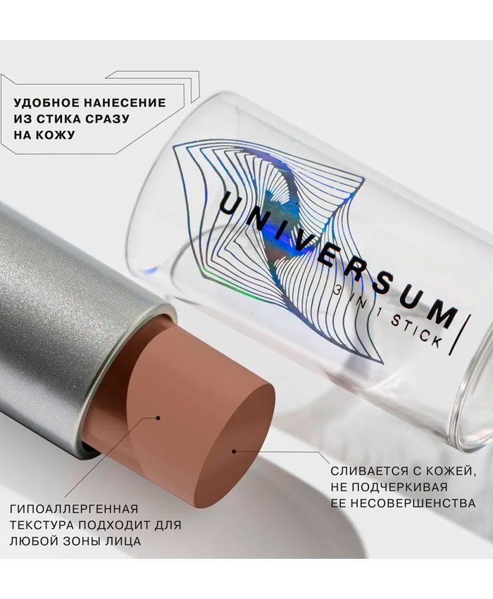 Стик 3-в-1 UNIVERSUM компактной формы может разгрузить косметичку, заменив несколько продуктов сразу.
